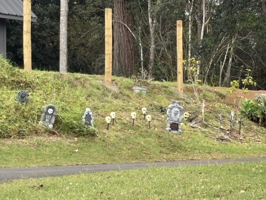 土曜日はワイメアに仕事で行ってきたのですが、近くの家の庭にはハロウィンの飾りがありました。これも秋を感じさせます。これから、ハロウィン飾りがどんどん増えていくのを見るのも楽しみです。