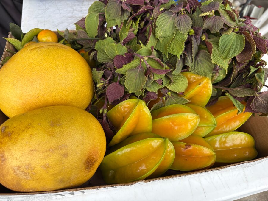 大きなものはザボンです。ハワイでもザボンと呼びます。九州だと、晩白柚かな?スターフルーツも今が旬ですね。沢山頂いたので、しばらく楽しめそう🎶。シソは季節ものではありませんが、蕾が出てきたので、その部分を詰んだようですね。早速、シゾジュースを作りました🍹。左上の小さいオレンジはカラマンシーと言われる酸味のある果物です。ライムのような感じで使います。