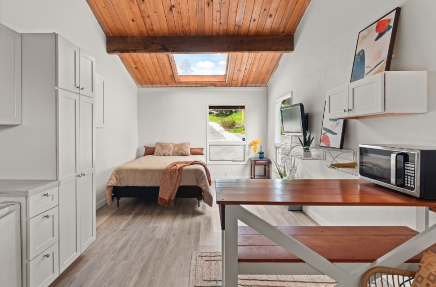 こちらのお部屋はミニキッチン、トイレ、シャワールーム、部屋専用のドアがあります。他の部屋とは駐車場を隔てているので、プライバシーもあり、貸して賃貸を稼ぐなど、いろいろな使い方ができますね。